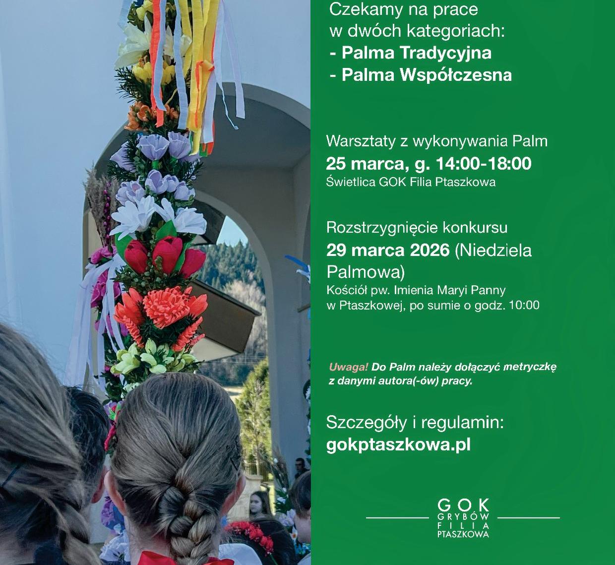 W niedzielę palmową, 29 marca po Sumie o godz. 10:00 przed Kościołem pw. Imienia Maryi Panny w Ptaszkowej tradycyjnie odbędzie się Gminny Konkurs Plastyczny Palm Wielkanocnych organizowany przez Gminny Ośrodek Kultury filia w Ptaszkowej.