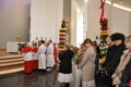 Niedziela Palmowa w tym roku miała nieco bardziej kameralny charakter. Zimowa aura i opady deszczu uniemożliwiły zorganizowanie tradycyjnego, procesyjnego wejścia do świątyni z palmami wielkanocnymi. Całość uroczystości odbyła się wewnątrz świątyni. Rozpoczęła się od poświęcenia przyniesionych palm, tych dużych i tych mniejszych, większość z nich wykonanych własnoręcznie, tradycyjnymi metodami. Ksiądz Proboszcz Stanisław Kurczab dokonał obrzędu poświęcenia palm przy uroczystym śpiewie Scholki Parafialnej. Od poświęcenia palm wielkanocnych rozpoczyna się celebracja Wielkiego Tygodnia.