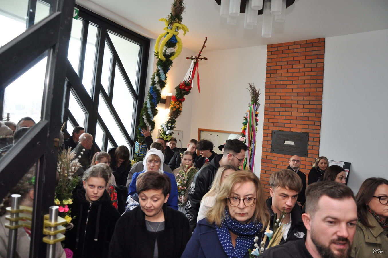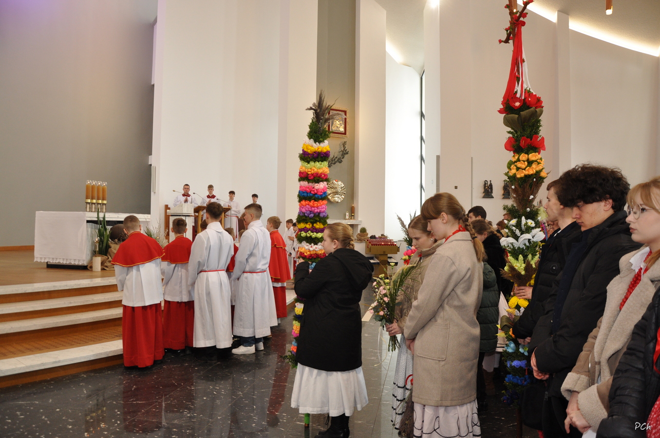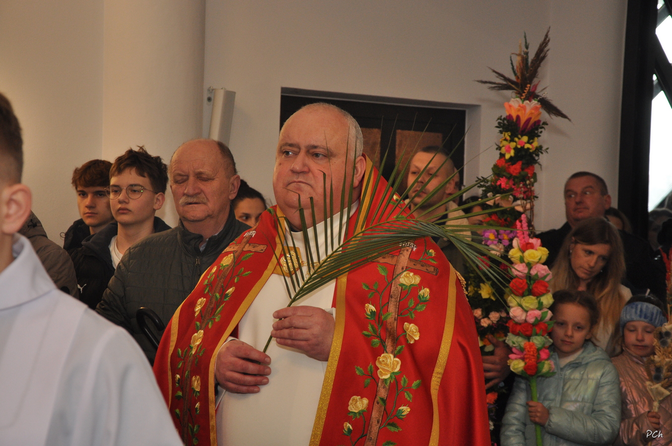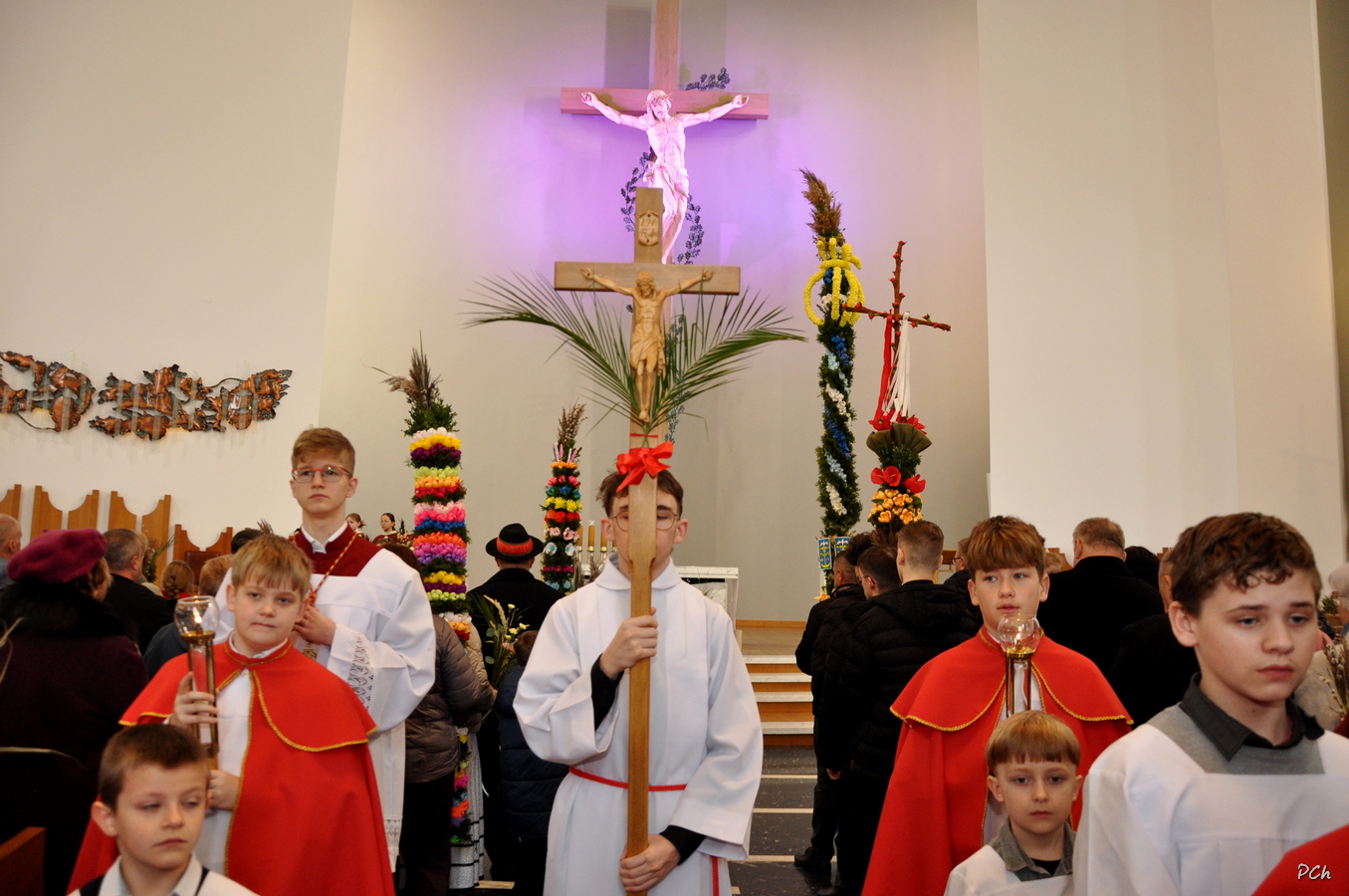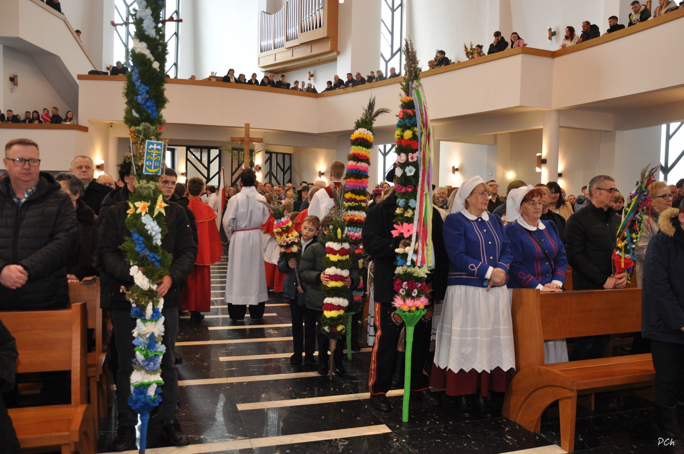 Niedziela Palmowa w tym roku miała nieco bardziej kameralny charakter. Zimowa aura i opady deszczu uniemożliwiły zorganizowanie tradycyjnego, procesyjnego wejścia do świątyni z palmami wielkanocnymi. Całość uroczystości odbyła się wewnątrz świątyni. Rozpoczęła się od poświęcenia przyniesionych palm, tych dużych i tych mniejszych, większość z nich wykonanych własnoręcznie, tradycyjnymi metodami. Ksiądz Proboszcz Stanisław Kurczab dokonał obrzędu poświęcenia palm przy uroczystym śpiewie Scholki Parafialnej. Od poświęcenia palm wielkanocnych rozpoczyna się celebracja Wielkiego Tygodnia.