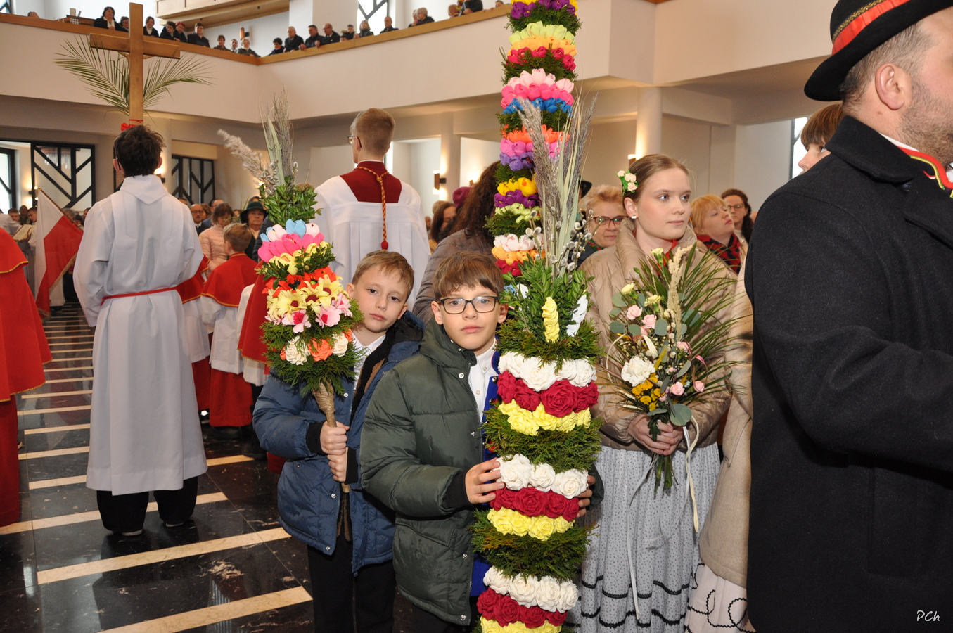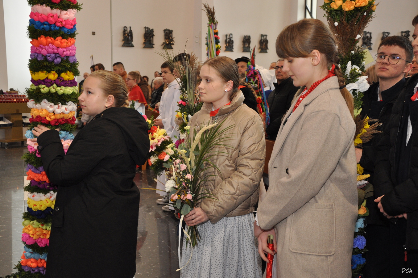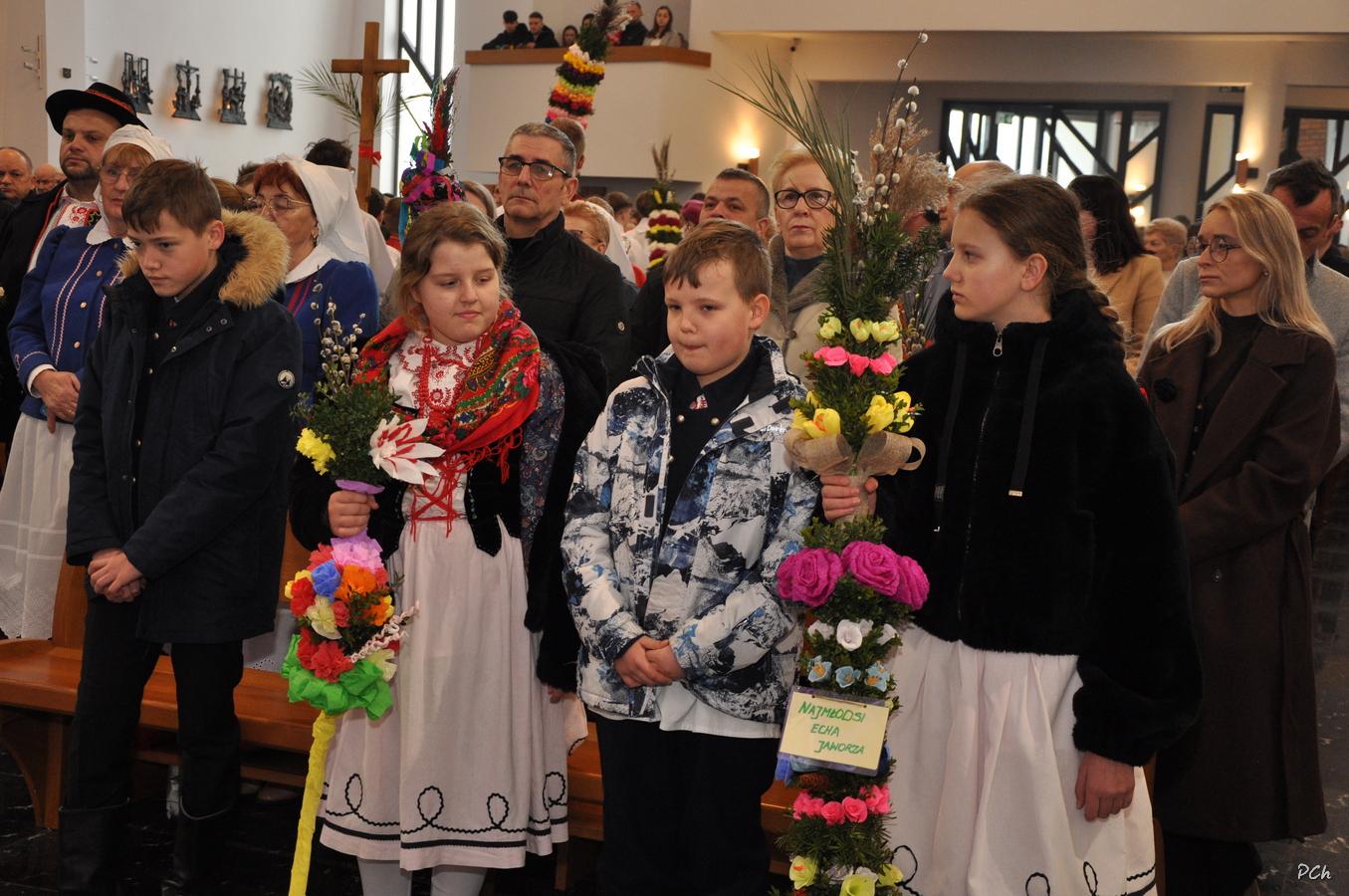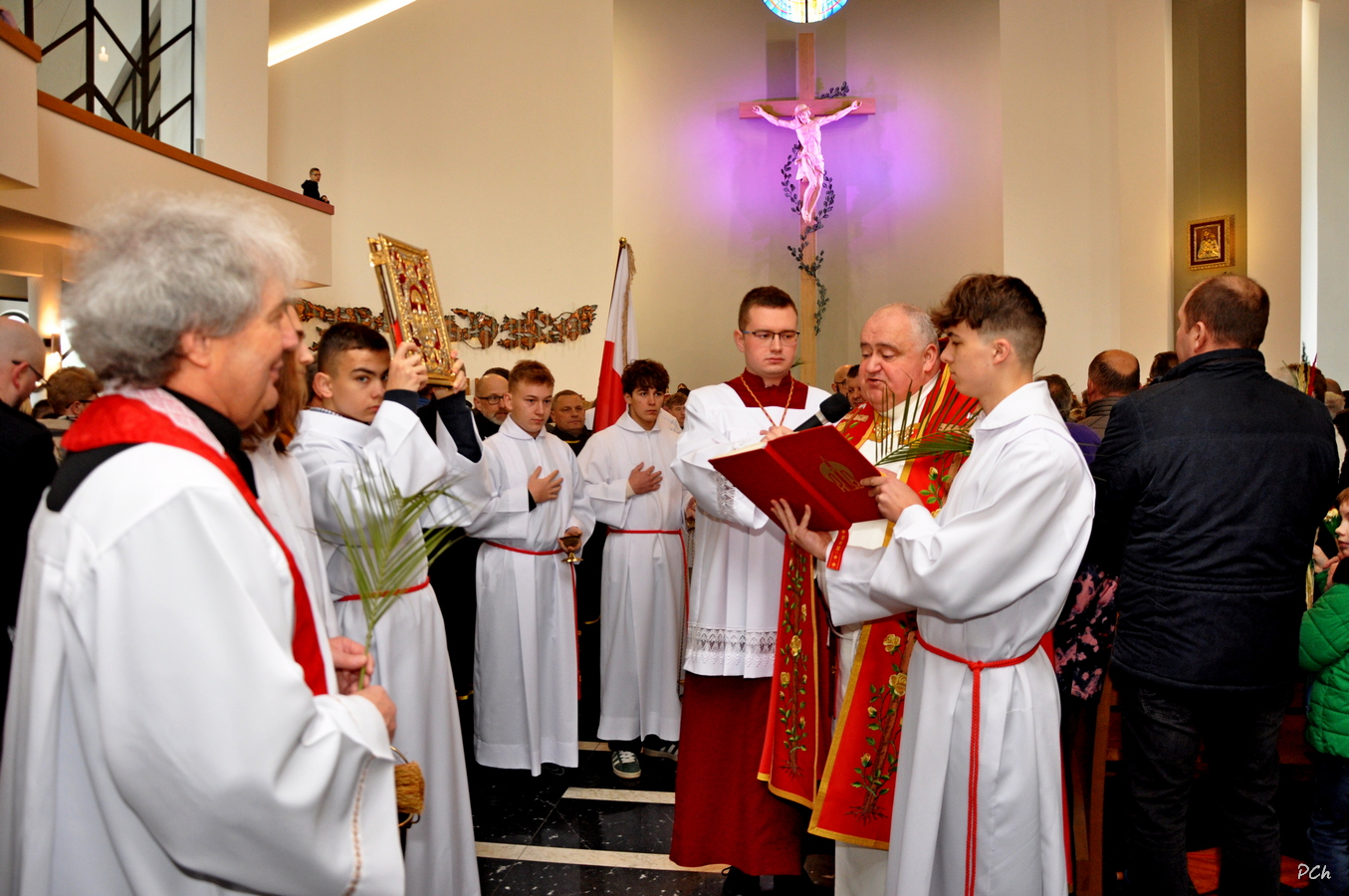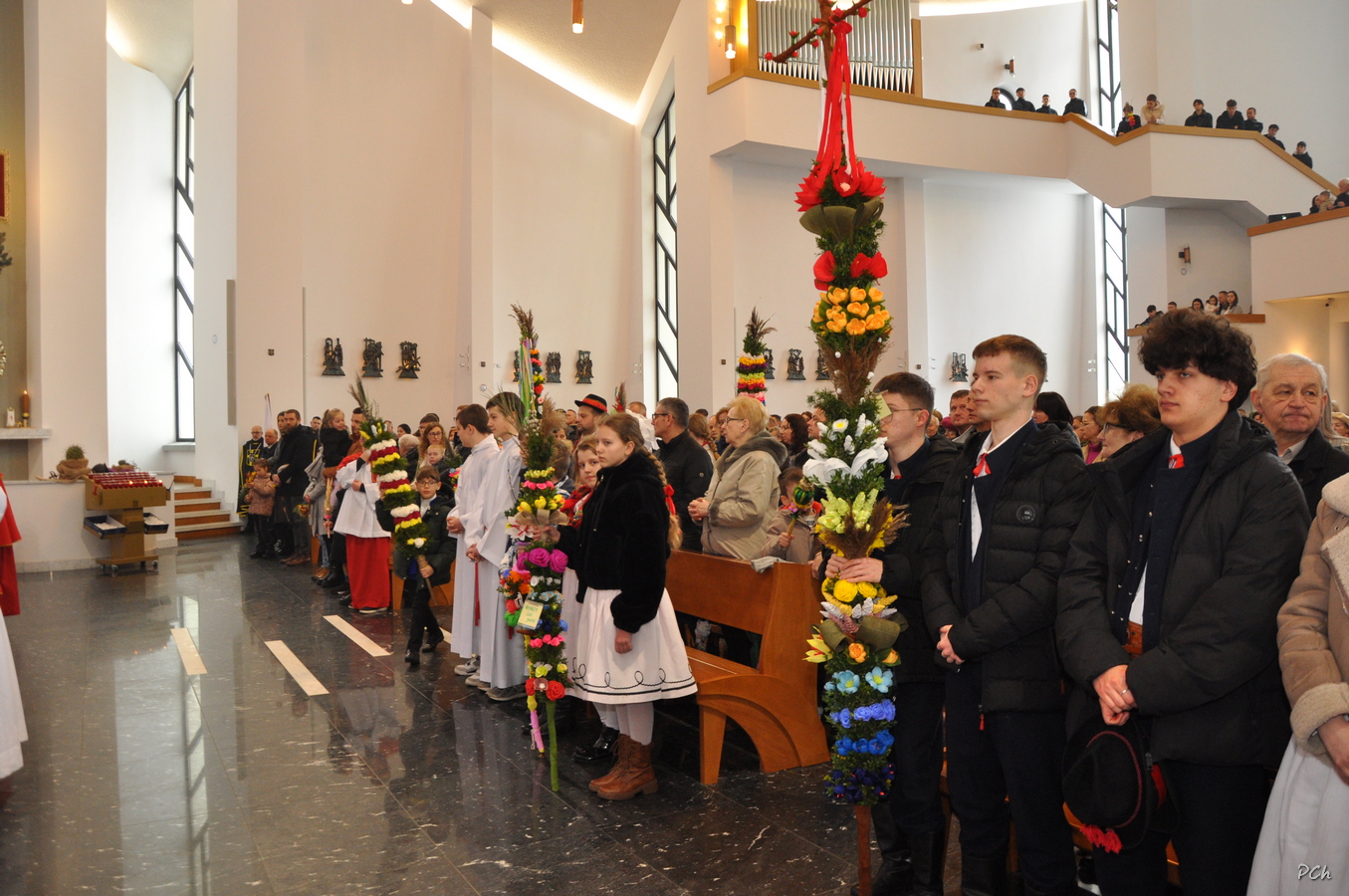 Niedziela Palmowa w tym roku miała nieco bardziej kameralny charakter. Zimowa aura i opady deszczu uniemożliwiły zorganizowanie tradycyjnego, procesyjnego wejścia do świątyni z palmami wielkanocnymi. Całość uroczystości odbyła się wewnątrz świątyni. Rozpoczęła się od poświęcenia przyniesionych palm, tych dużych i tych mniejszych, większość z nich wykonanych własnoręcznie, tradycyjnymi metodami. Ksiądz Proboszcz Stanisław Kurczab dokonał obrzędu poświęcenia palm przy uroczystym śpiewie Scholki Parafialnej. Od poświęcenia palm wielkanocnych rozpoczyna się celebracja Wielkiego Tygodnia.