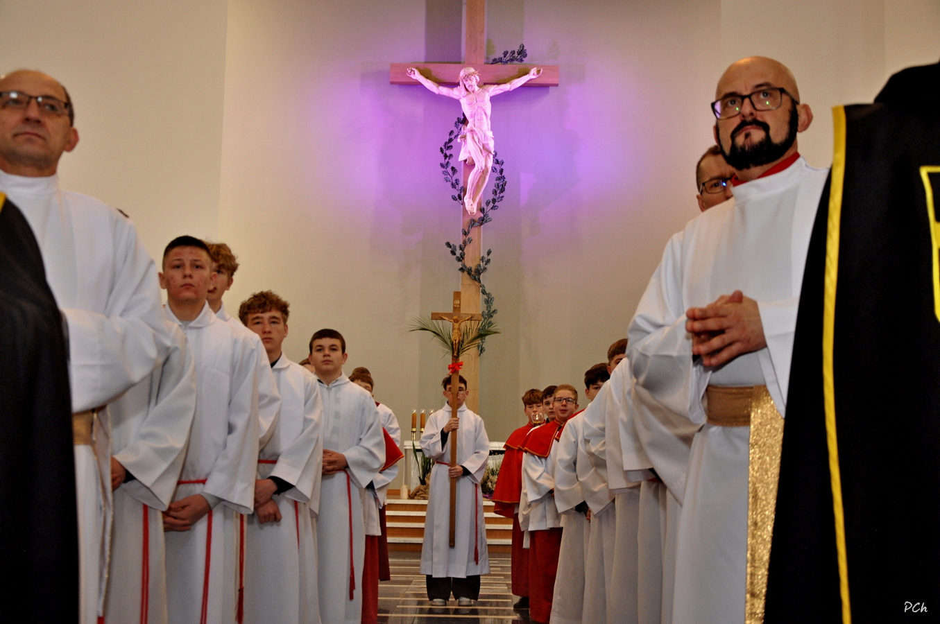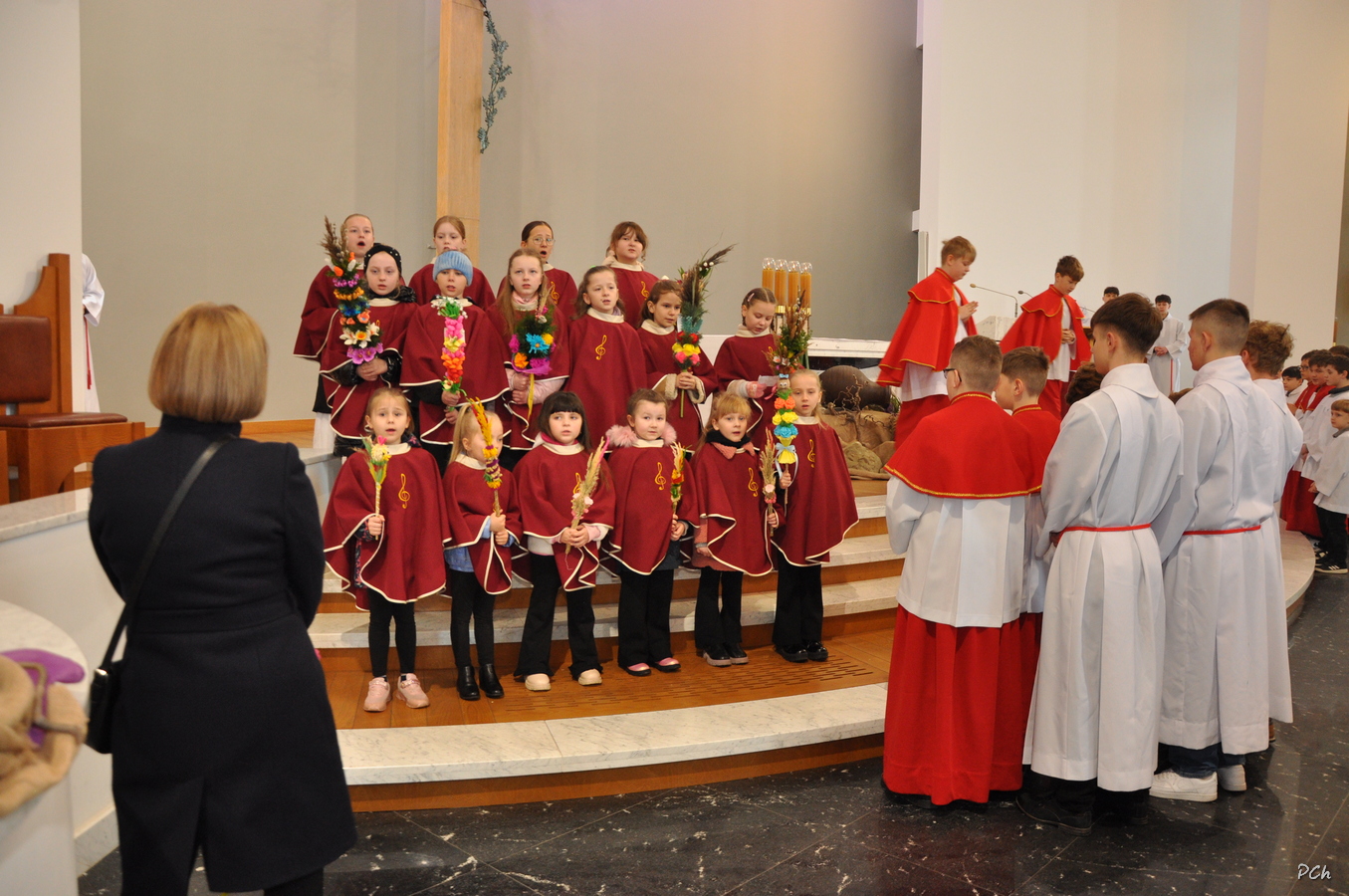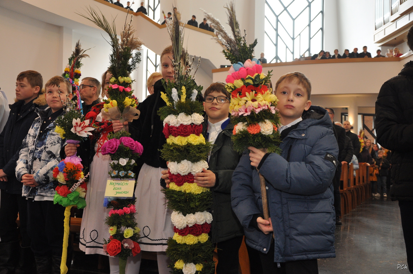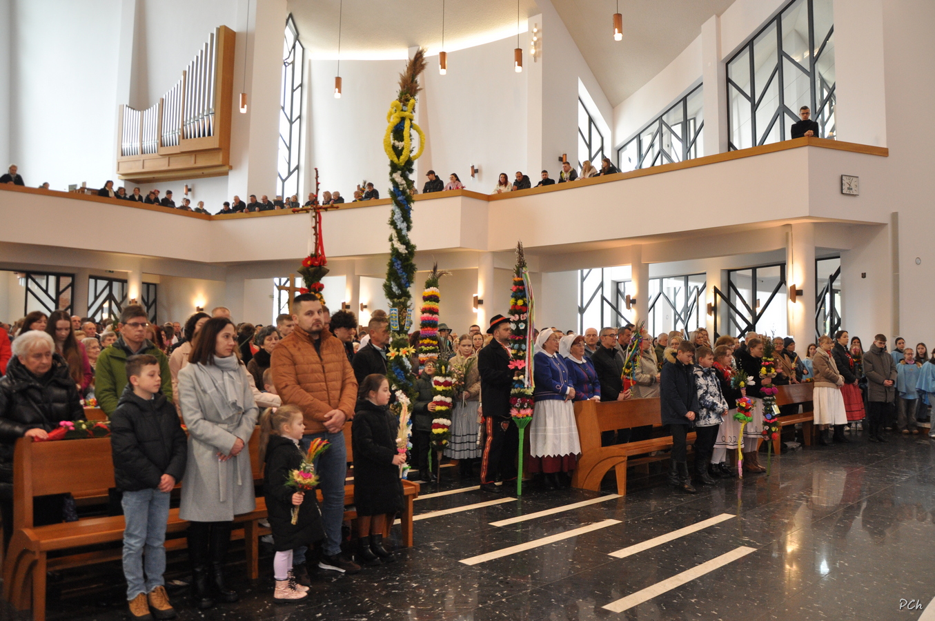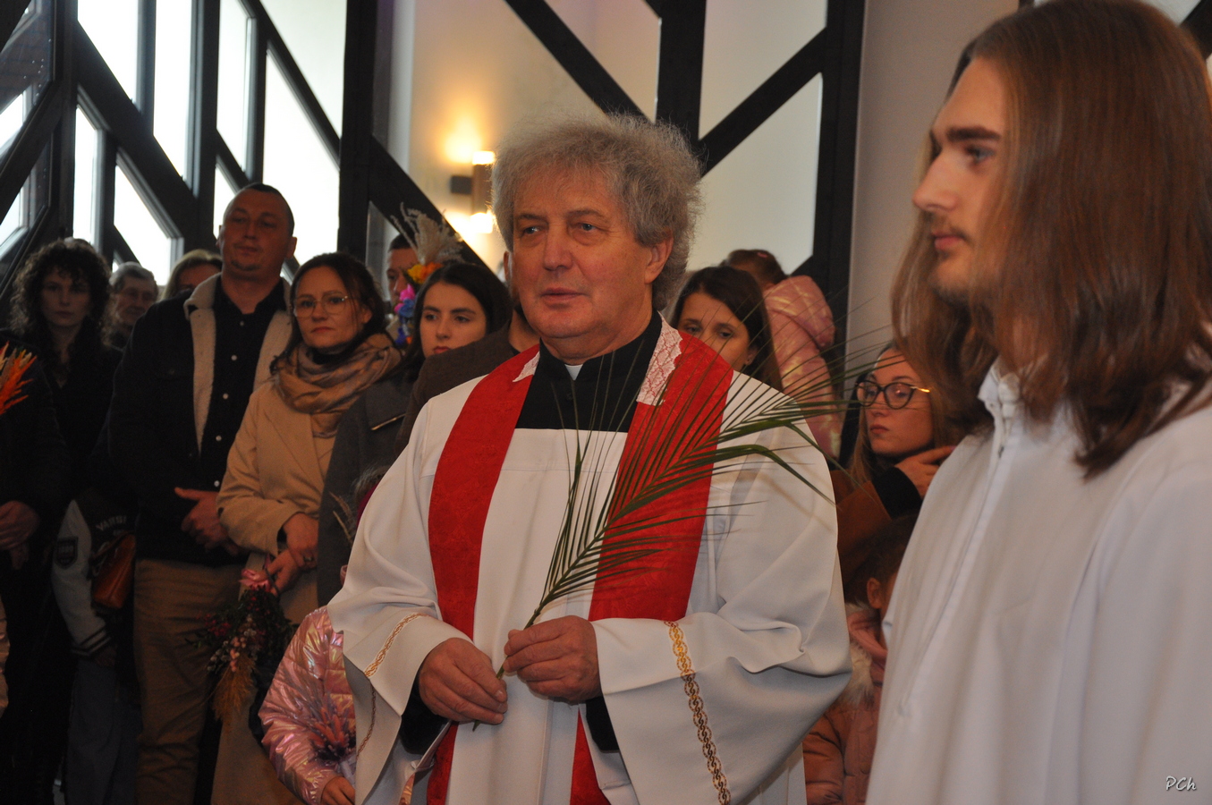 Niedziela Palmowa w tym roku miała nieco bardziej kameralny charakter. Zimowa aura i opady deszczu uniemożliwiły zorganizowanie tradycyjnego, procesyjnego wejścia do świątyni z palmami wielkanocnymi. Całość uroczystości odbyła się wewnątrz świątyni. Rozpoczęła się od poświęcenia przyniesionych palm, tych dużych i tych mniejszych, większość z nich wykonanych własnoręcznie, tradycyjnymi metodami. Ksiądz Proboszcz Stanisław Kurczab dokonał obrzędu poświęcenia palm przy uroczystym śpiewie Scholki Parafialnej. Od poświęcenia palm wielkanocnych rozpoczyna się celebracja Wielkiego Tygodnia.