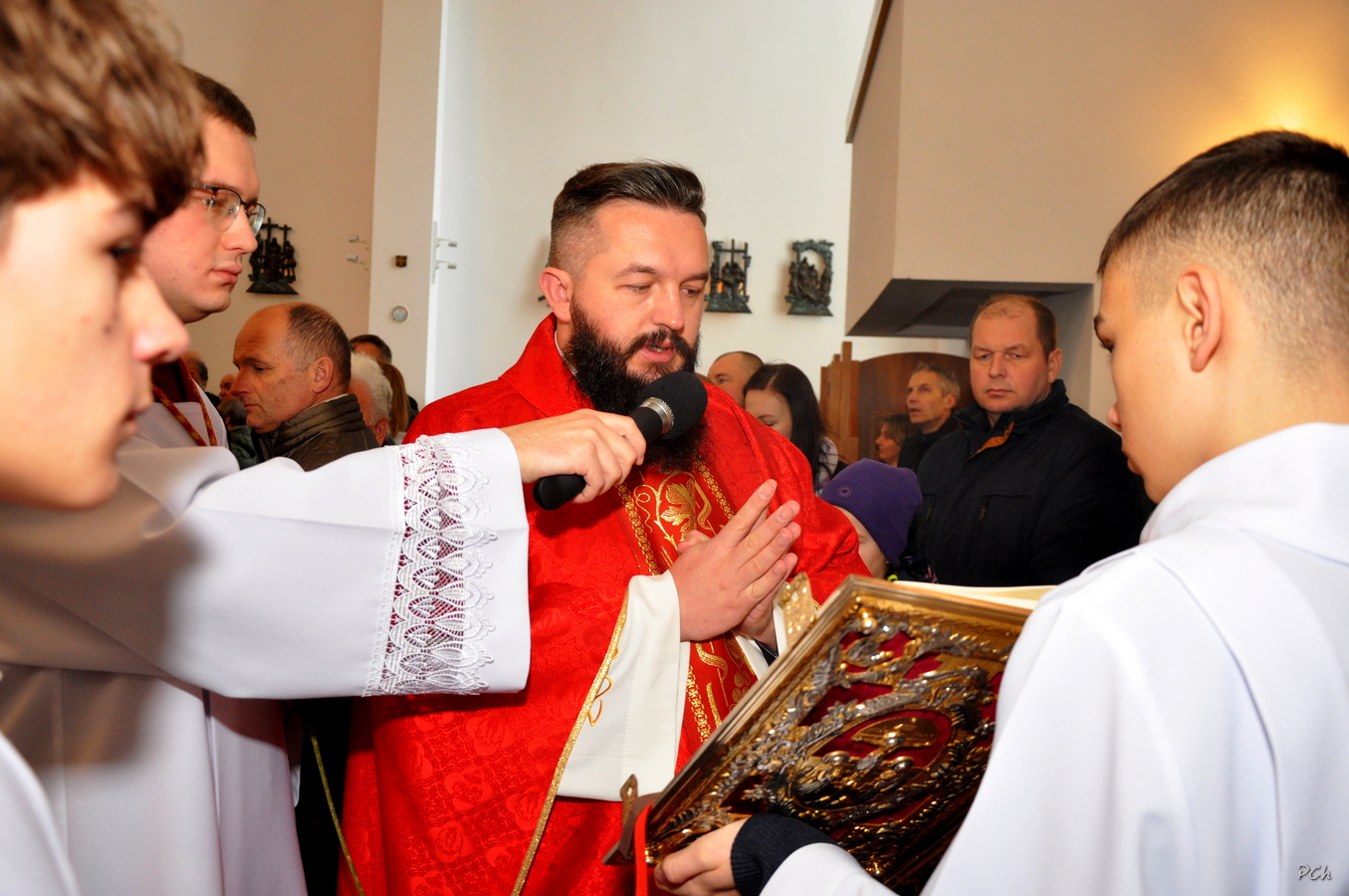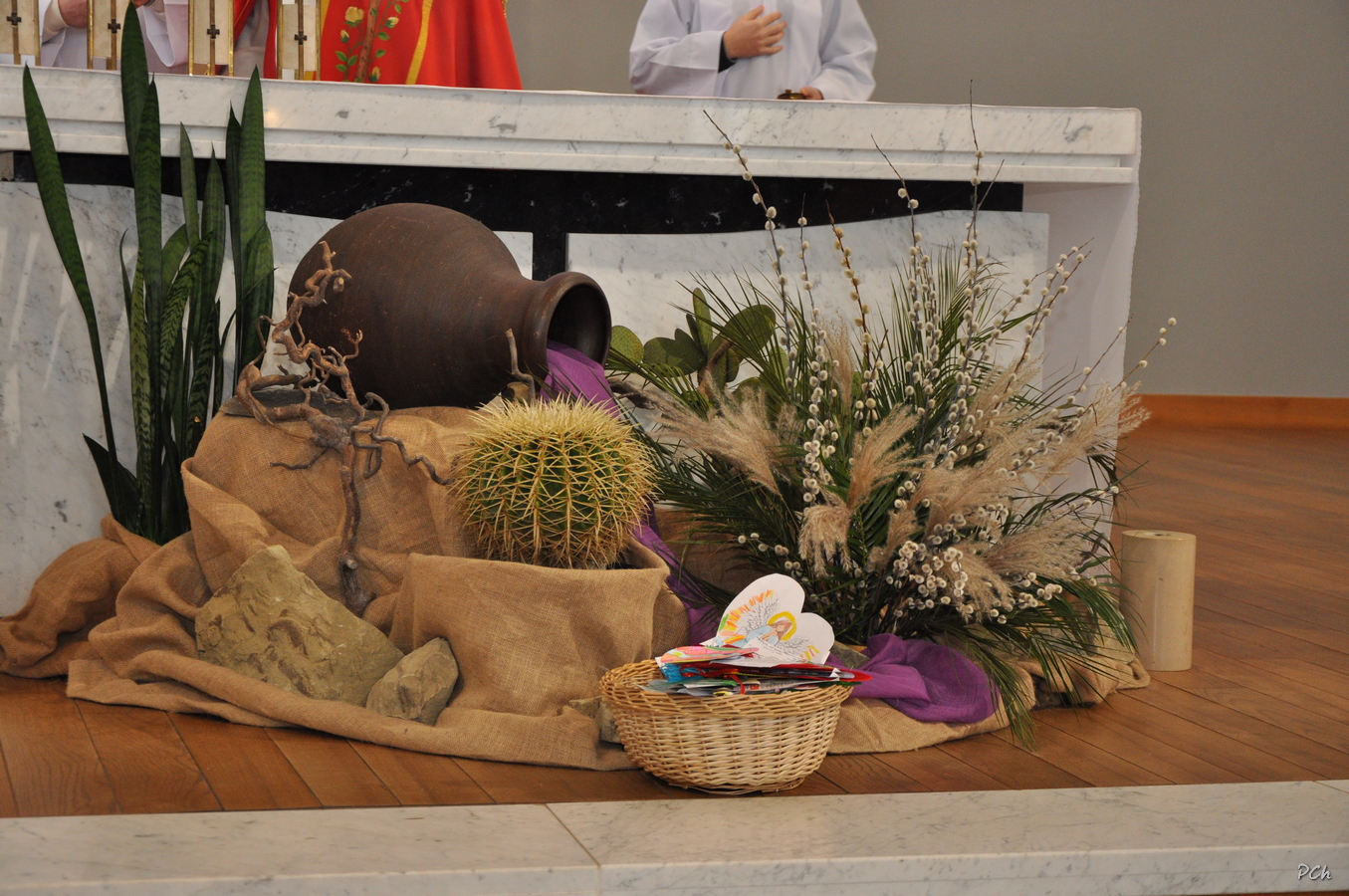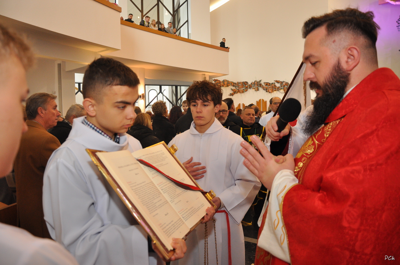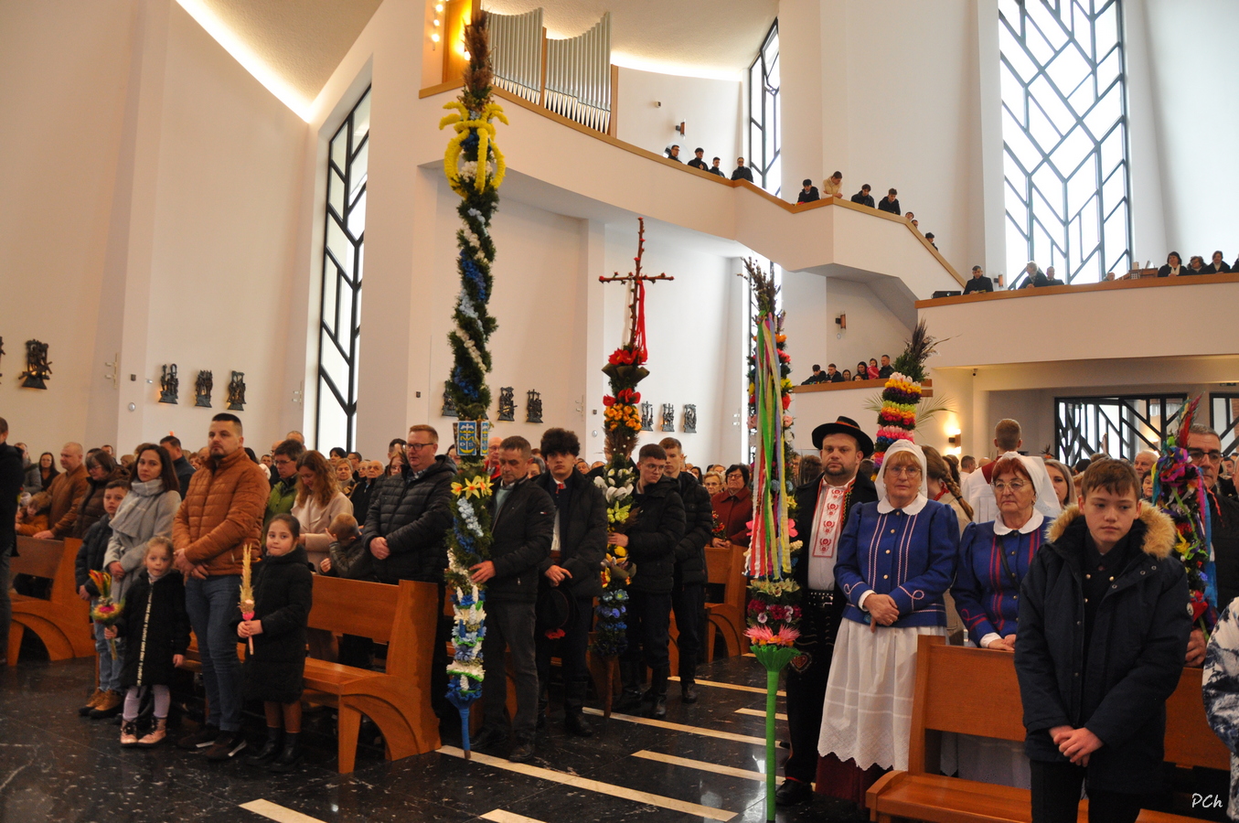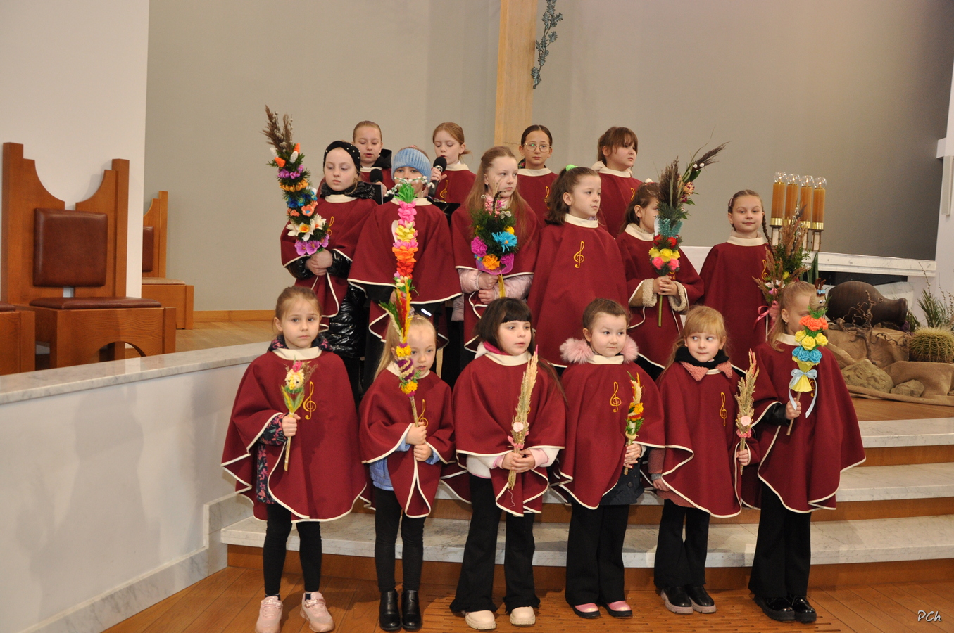 Niedziela Palmowa w tym roku miała nieco bardziej kameralny charakter. Zimowa aura i opady deszczu uniemożliwiły zorganizowanie tradycyjnego, procesyjnego wejścia do świątyni z palmami wielkanocnymi. Całość uroczystości odbyła się wewnątrz świątyni. Rozpoczęła się od poświęcenia przyniesionych palm, tych dużych i tych mniejszych, większość z nich wykonanych własnoręcznie, tradycyjnymi metodami. Ksiądz Proboszcz Stanisław Kurczab dokonał obrzędu poświęcenia palm przy uroczystym śpiewie Scholki Parafialnej. Od poświęcenia palm wielkanocnych rozpoczyna się celebracja Wielkiego Tygodnia.
