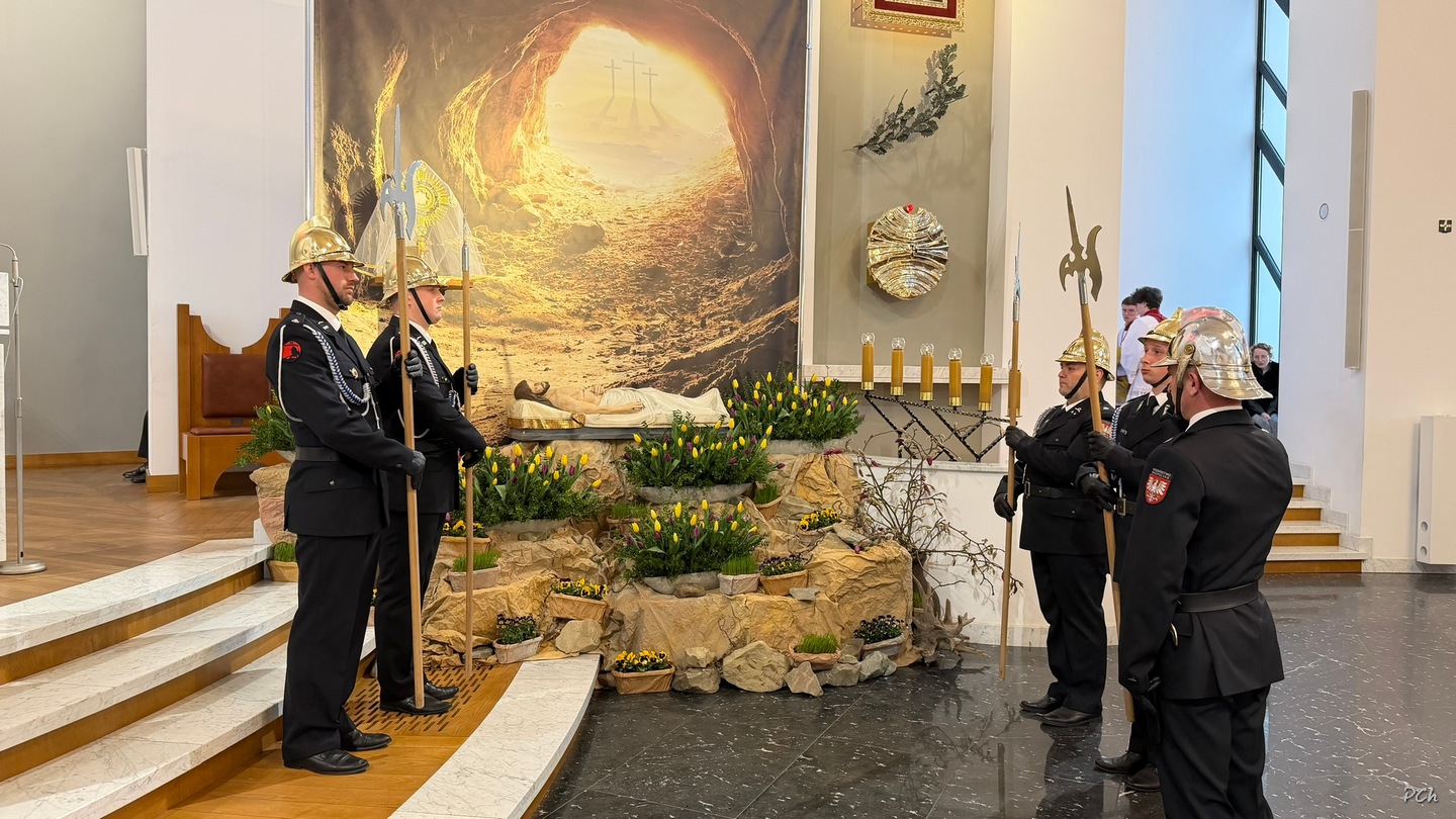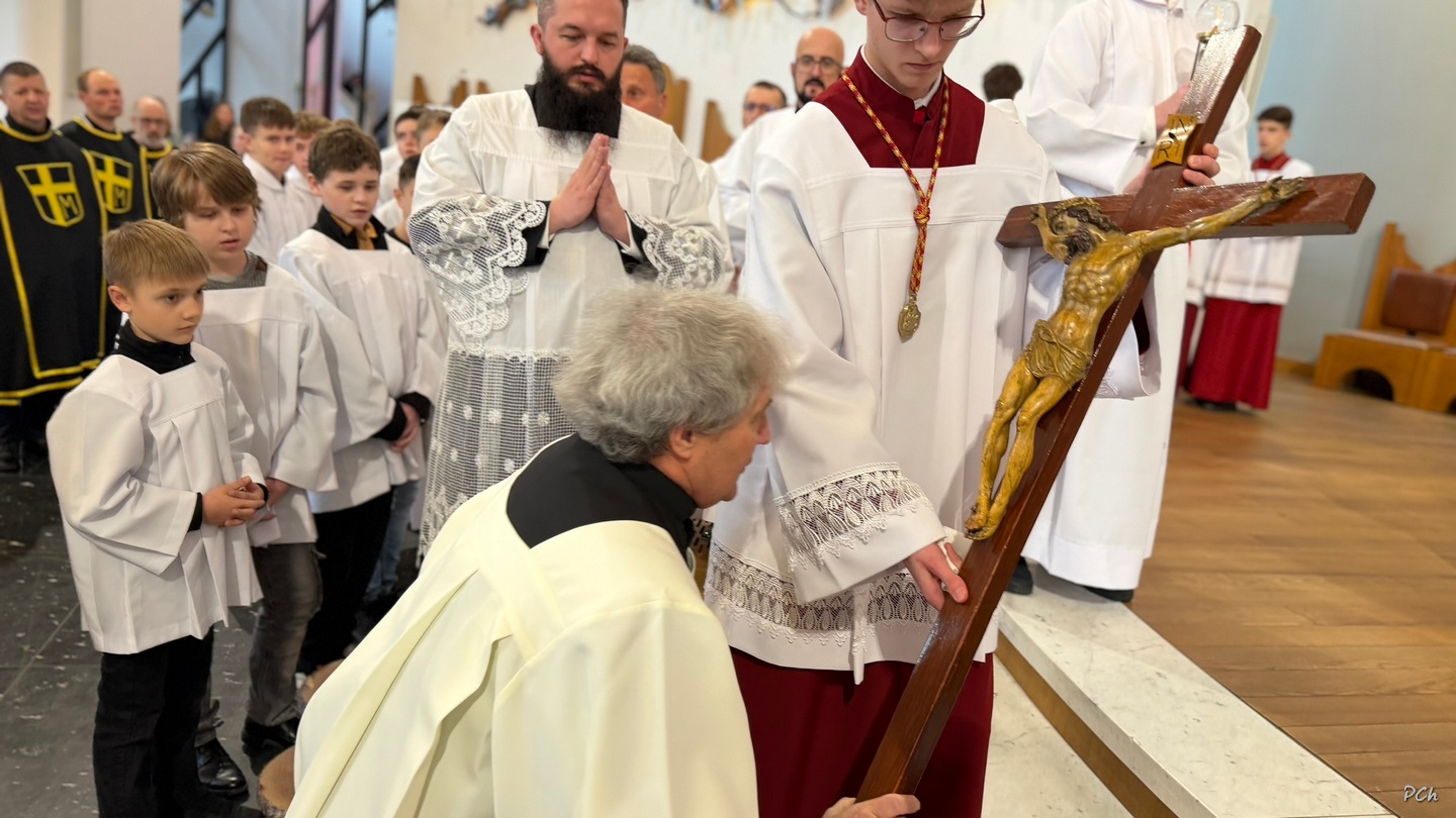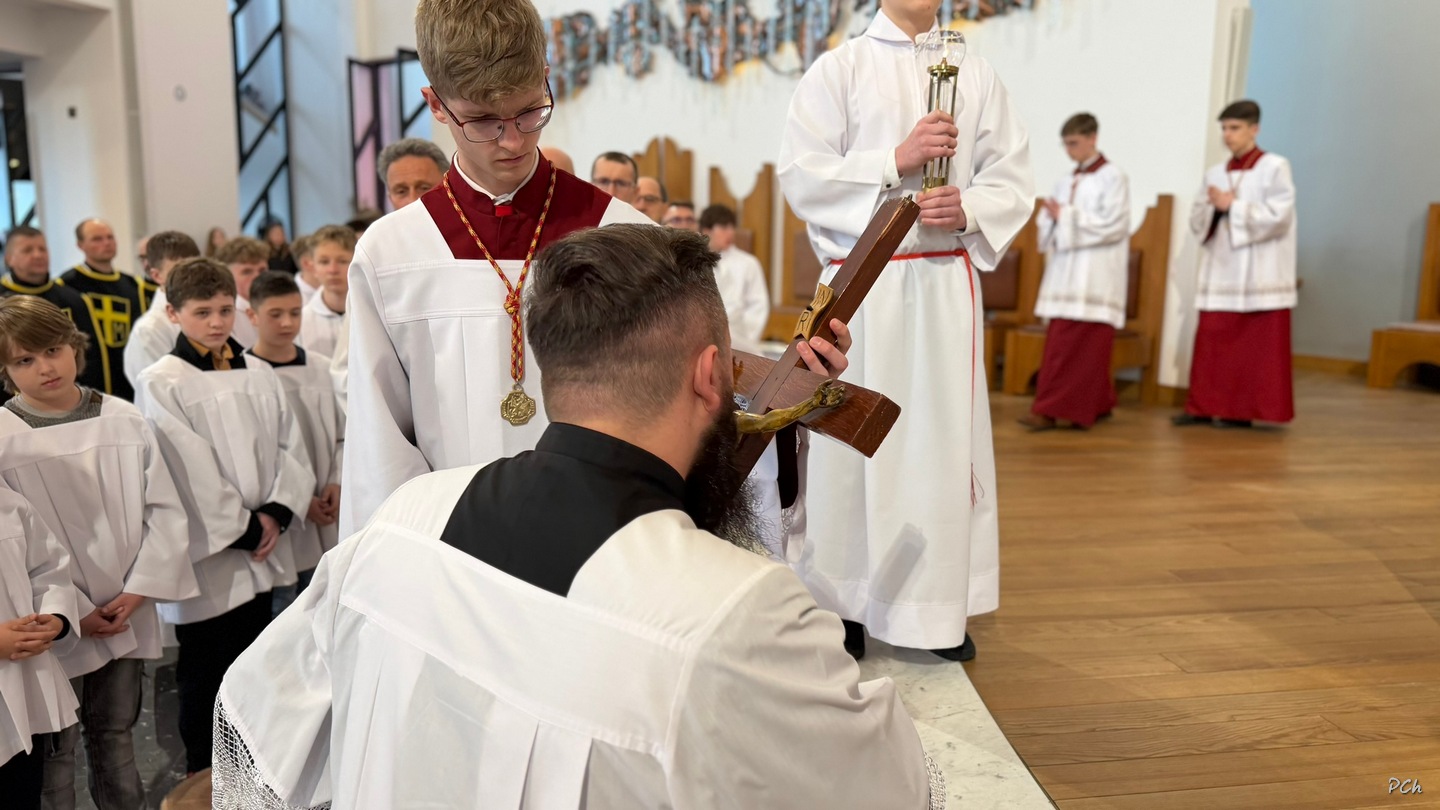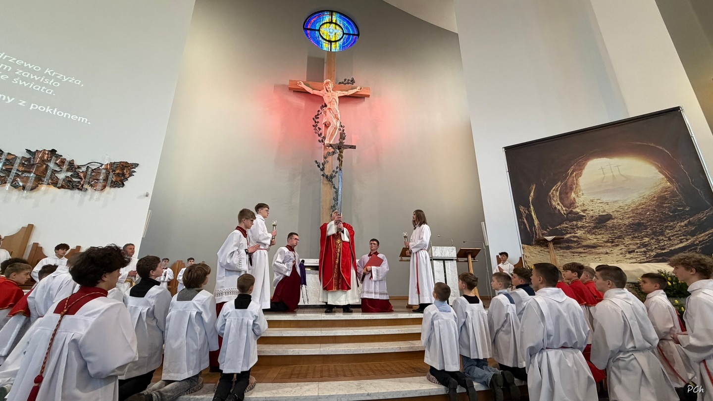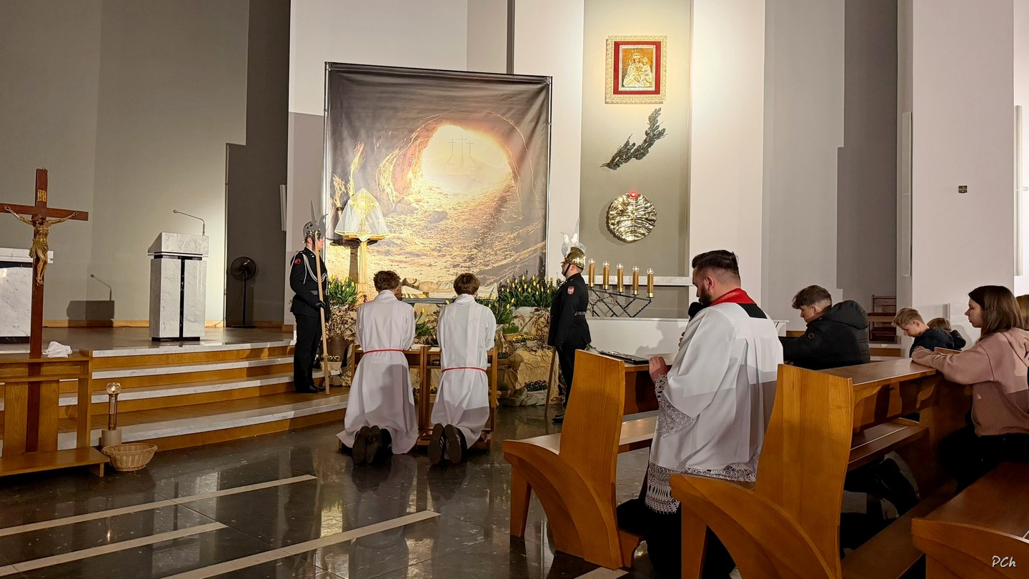 Wielki Piątek to dzień skupienia i zadumy nad ofiarą Jezusa na krzyżu. Tego dnia nie sprawuje się Mszy Świętej. Podczas liturgii kantorzy odśpiewali opis Męki Pańskiej wg ewangelii Św. Jana. Kapłan odsłonił zasłonięty do tej pory krzyż, trzykrotnie śpiewając wezwanie „Oto Drzewo Krzyża na którym zawisło Zbawienie Świata”. Po liturgii Najświętszy Sakrament został przeniesiony do Grobu Pańskiego a druhny i druhowie naszej OSP zaciągnęli tradycyjną wartę honorową przy Grobie Pańskim. Adoracja trwała do północy a zakończyła się tradycyjną Drogą Krzyżową z udziałem Scholi Młodzieżowej.