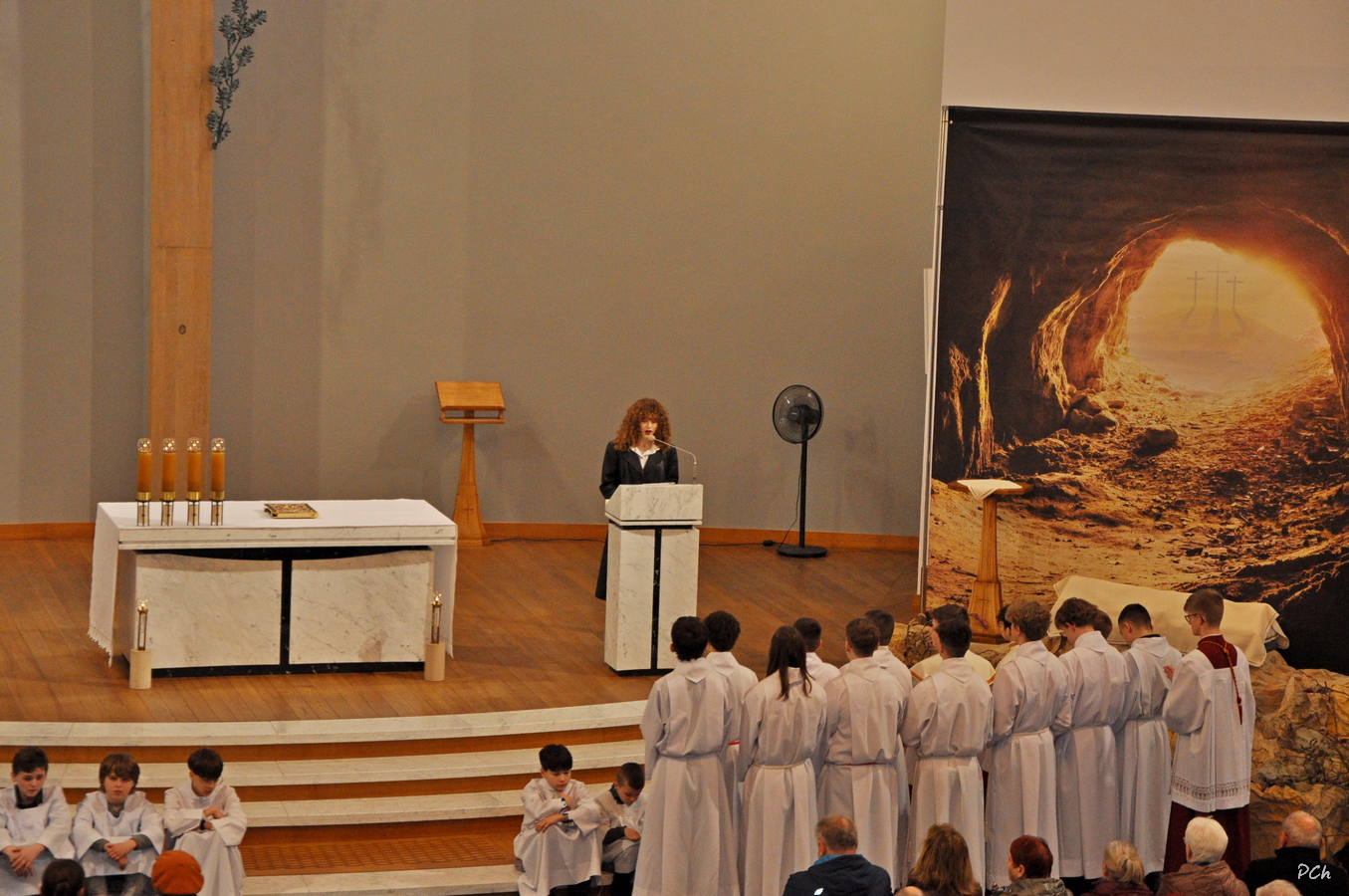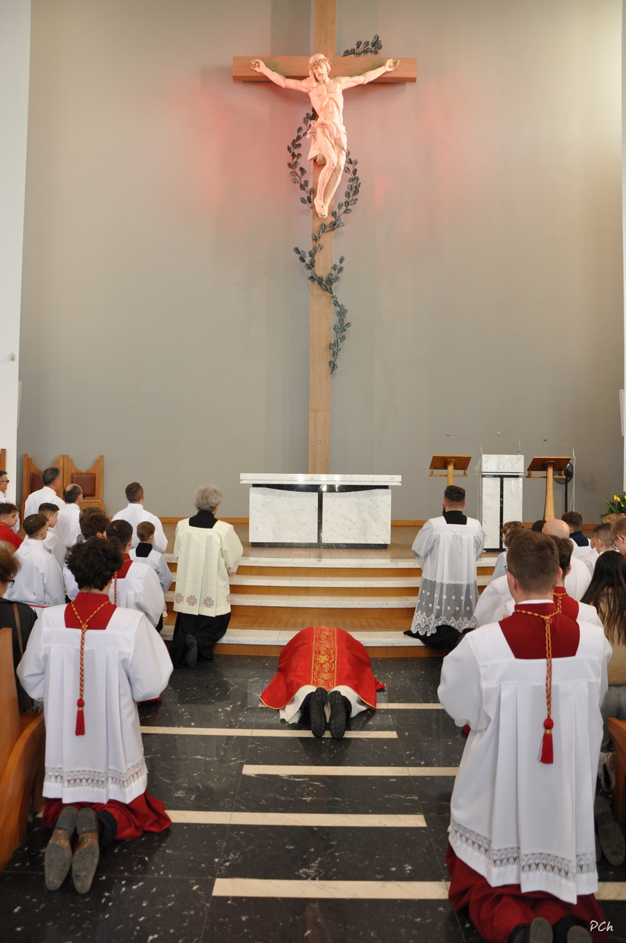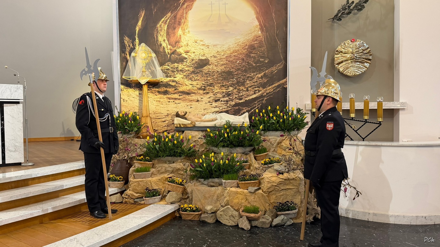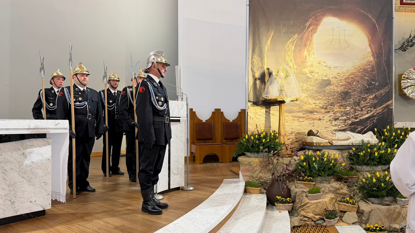 Wielki Piątek to dzień skupienia i zadumy nad ofiarą Jezusa na krzyżu. Tego dnia nie sprawuje się Mszy Świętej. Podczas liturgii kantorzy odśpiewali opis Męki Pańskiej wg ewangelii Św. Jana. Kapłan odsłonił zasłonięty do tej pory krzyż, trzykrotnie śpiewając wezwanie „Oto Drzewo Krzyża na którym zawisło Zbawienie Świata”. Po liturgii Najświętszy Sakrament został przeniesiony do Grobu Pańskiego a druhny i druhowie naszej OSP zaciągnęli tradycyjną wartę honorową przy Grobie Pańskim. Adoracja trwała do północy a zakończyła się tradycyjną Drogą Krzyżową z udziałem Scholi Młodzieżowej.